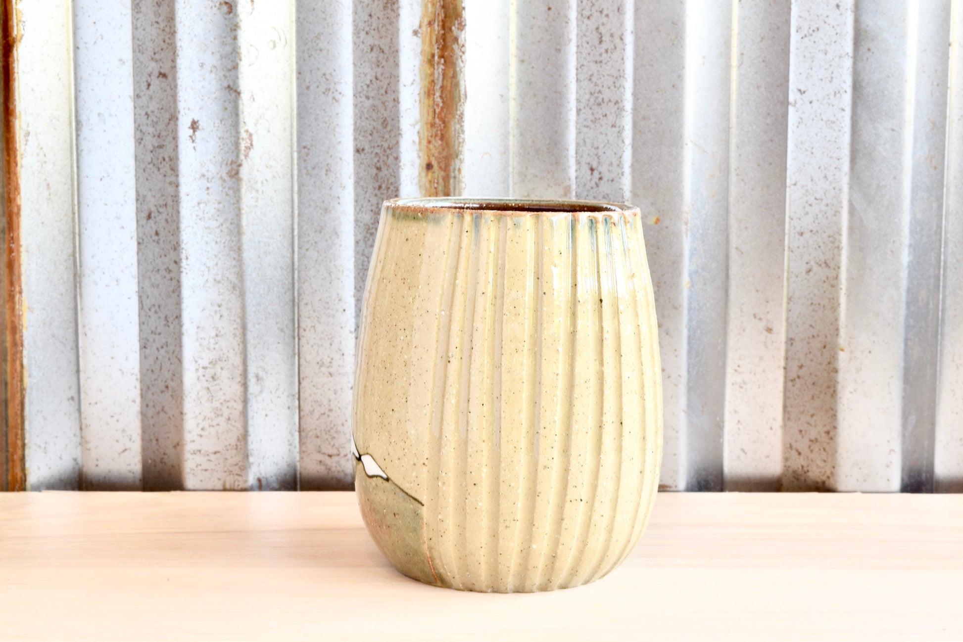 This cup is hand thrown on the potters wheel from a ochre stoneware clay. I hand stamped and hand paint each cup. I hand draw the mountains with black underglaze and paint each mountain with green shino. There is texture on one side for easy gripping. The interior is glazed with green shino and the exterior of the cup is finished with a clear glaze coat.