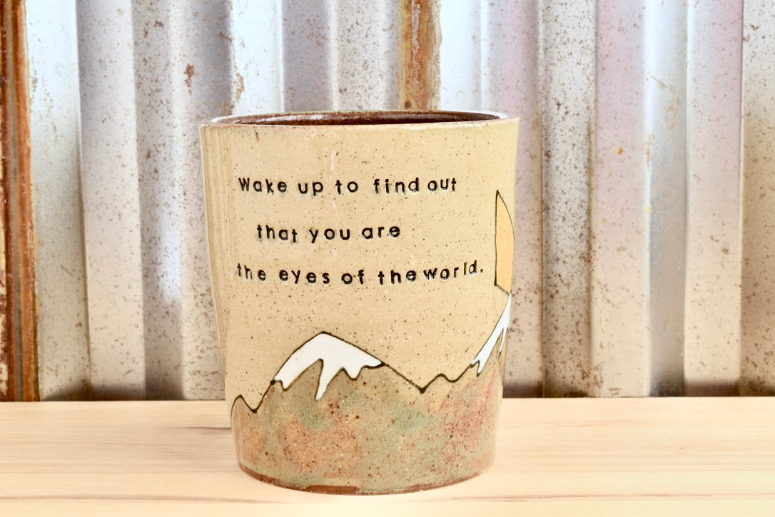 This ochre cup is hand thrown and hand painted and hand stamped. The interior and mountains are glazed with a green shino and the exterior is finished with a clear gloss glaze. The text is glazed with a black underglaze.