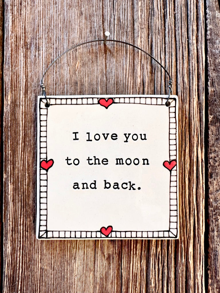 This plaque is made from a creamy porcelain stoneware mix clay. I hand stamp the letters and paint them with black underglaze. The hearts are hand drawn with underglaze. The plaque is finished with a clear gloss glaze and topped off with a wire for hanging.
