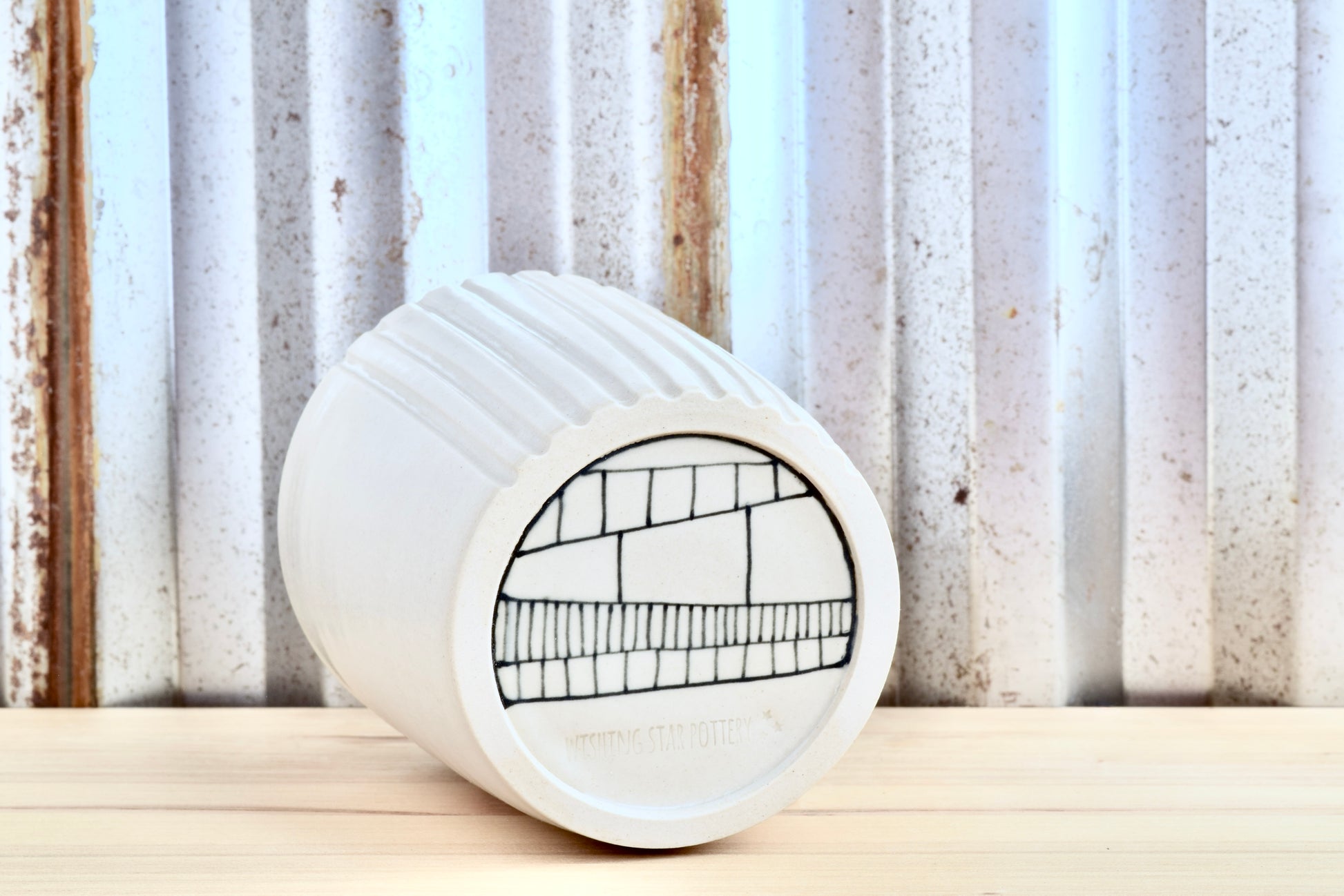 I throw this tumbler from a creamy porcelain mix clay. The letters are hand stamped and painted with black underglaze. There is texture on one side for easy gripping. I hand draw the design on the bottom with black underglaze.