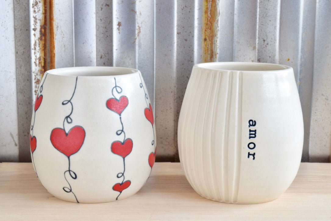 I throw this tumbler from a creamy porcelain mix clay. The letters are hand stamped and painted with black underglaze. There is texture on one side for easy gripping. There are red heartstrings on the bottom. The cup is finished with a soft clear satin matte glaze.