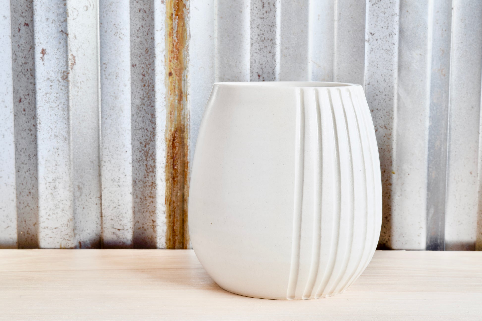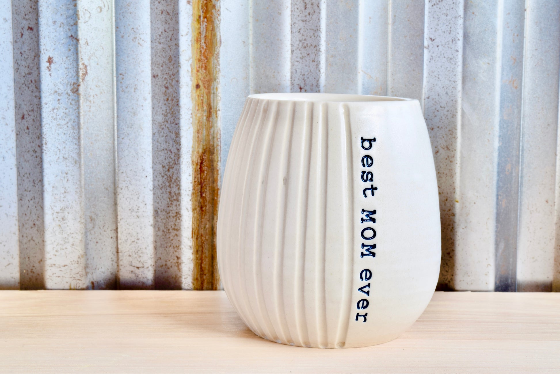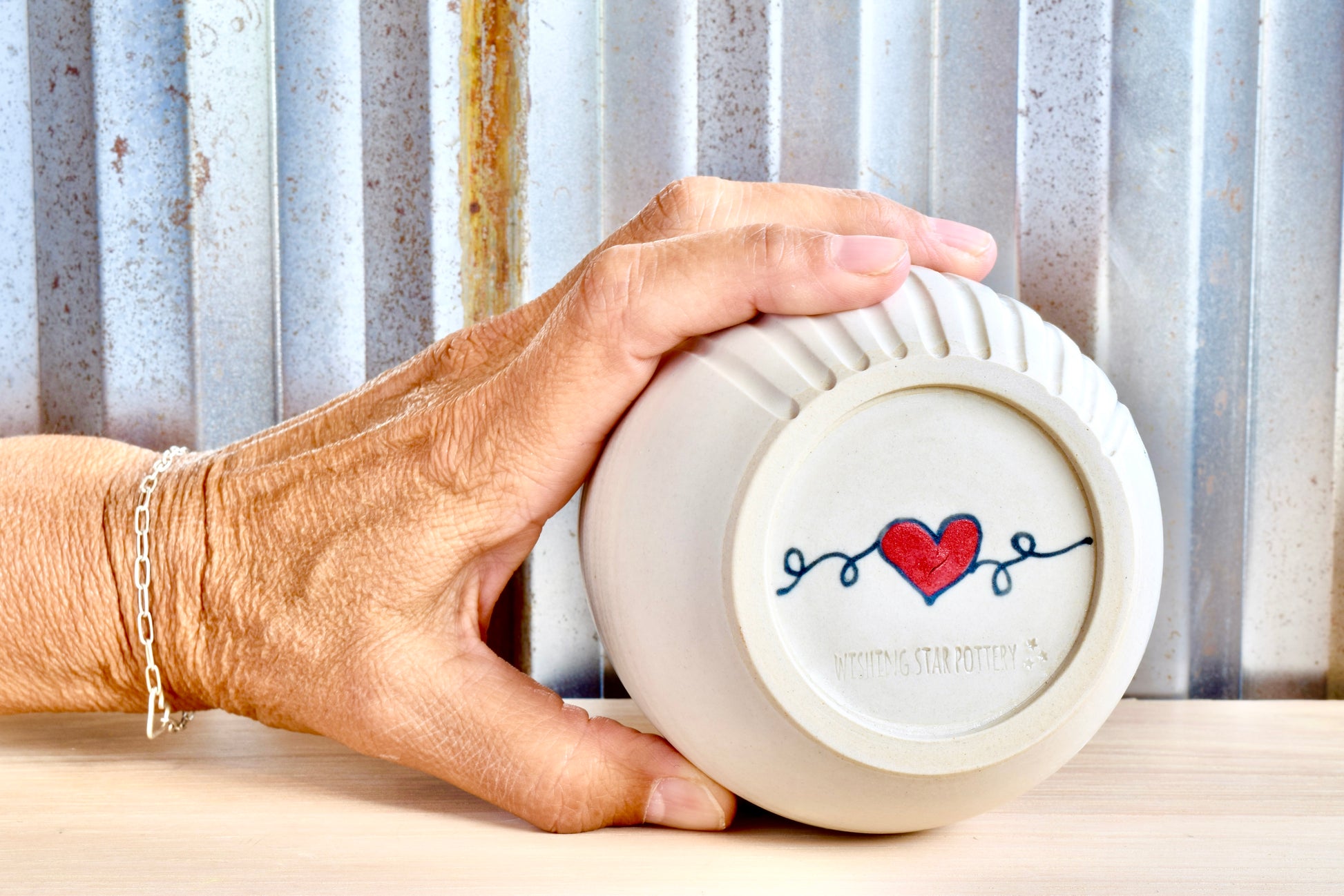 I throw this tumbler from a creamy porcelain mix clay. The letters are hand stamped and painted with black underglaze. There is texture on one side for easy gripping. There are red painted hearts on the bottom. The cup is finished with a soft clear satin matte glaze.