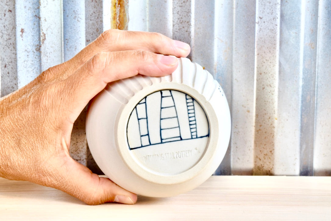 I throw this tumbler from a creamy porcelain mix clay. The letters are hand stamped and painted with black underglaze. There is texture on one side for easy gripping. There are red painted hearts on the bottom.