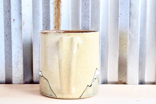 This ochre mug is hand thrown and hand painted and hand stamped. The interior and mountains are glazed with a green shino and the exterior is finished with a clear gloss glaze. The text is glazed with a black underglaze.
