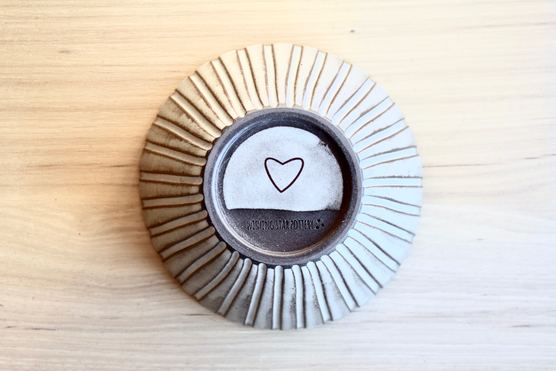 I hand throw this bowl from chocolate stoneware clay. It is hand carved and glazed with an eggshell gloss. The original art mandala and text decals are applied and fired in the kiln a 3rd time.