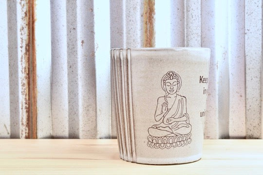 This cup was hand thrown on the potter's wheel from a creamy chocolate clay. It is glazed with a lovely eggshell glaze inside and out. The buddha illustration is original art by my friend Kellie Day. The decals are applied over the glaze and the cup is fired a third time to permanently affix the decal to the cup.