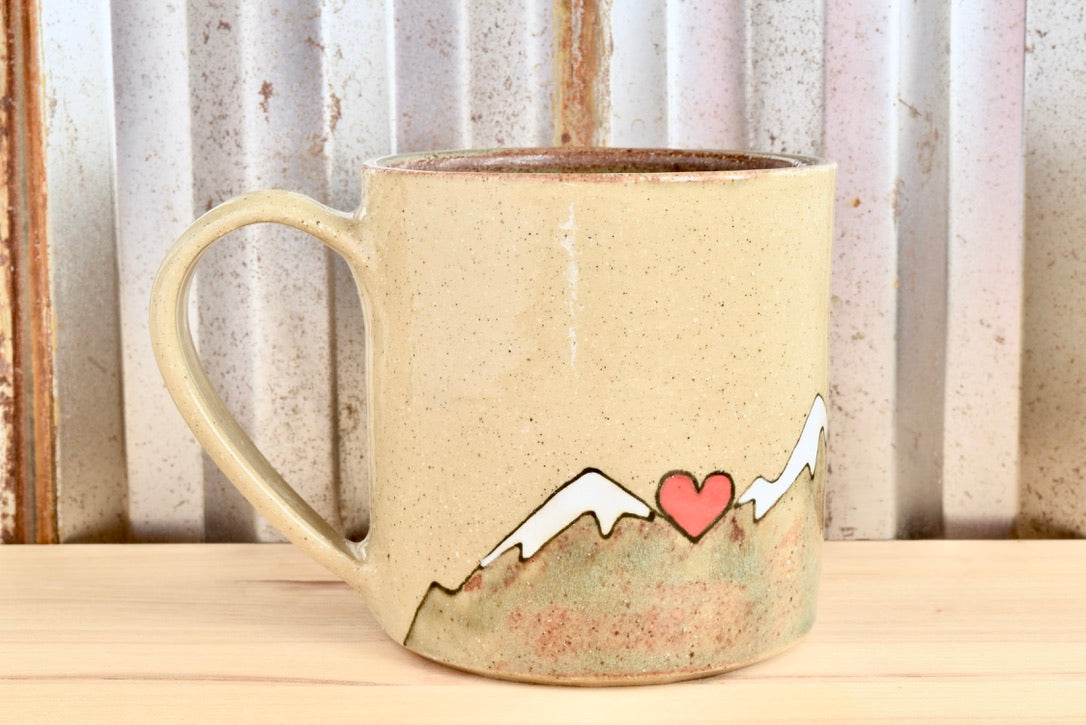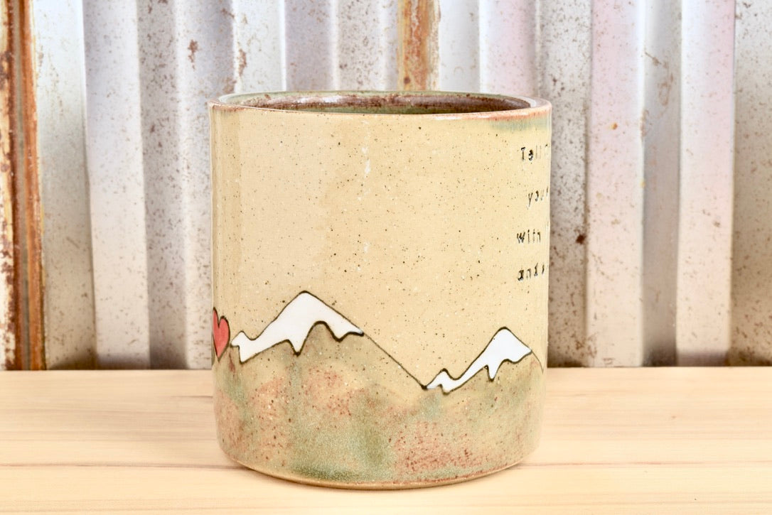 This ochre mug is hand thrown and hand painted and hand stamped. The interior and mountains are glazed with a green shino and the exterior is finished with a clear gloss glaze. The text is glazed with a black underglaze.