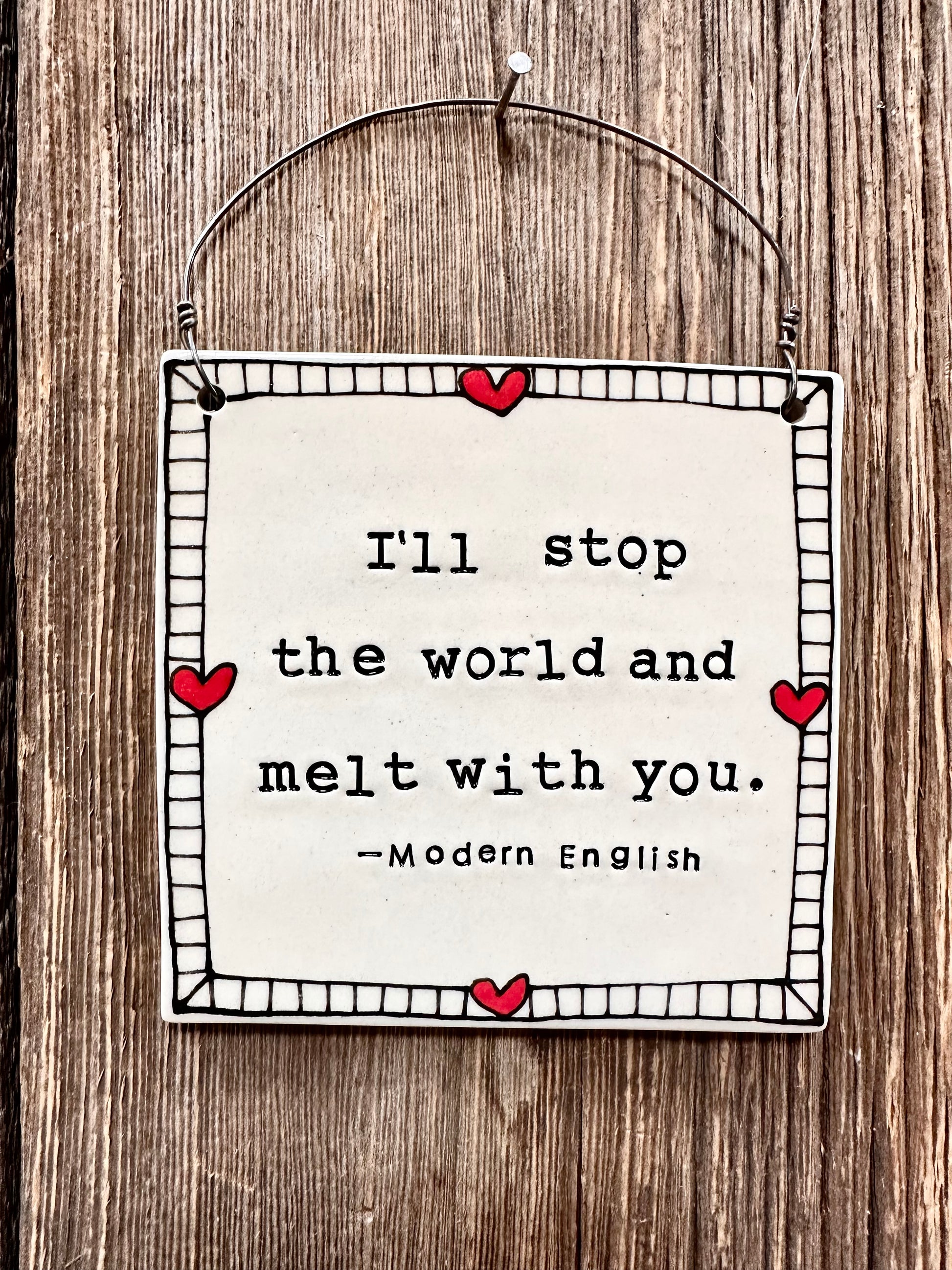 This plaque is made from a creamy porcelain stoneware mix clay. I hand stamp the letters and paint them with black underglaze. The heart border is hand drawn with black and red underglaze. The plaque is finished with a clear gloss glaze and topped off with a wire for hanging.
