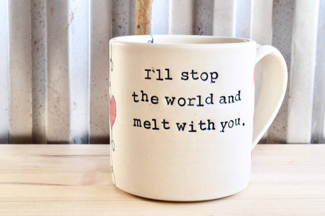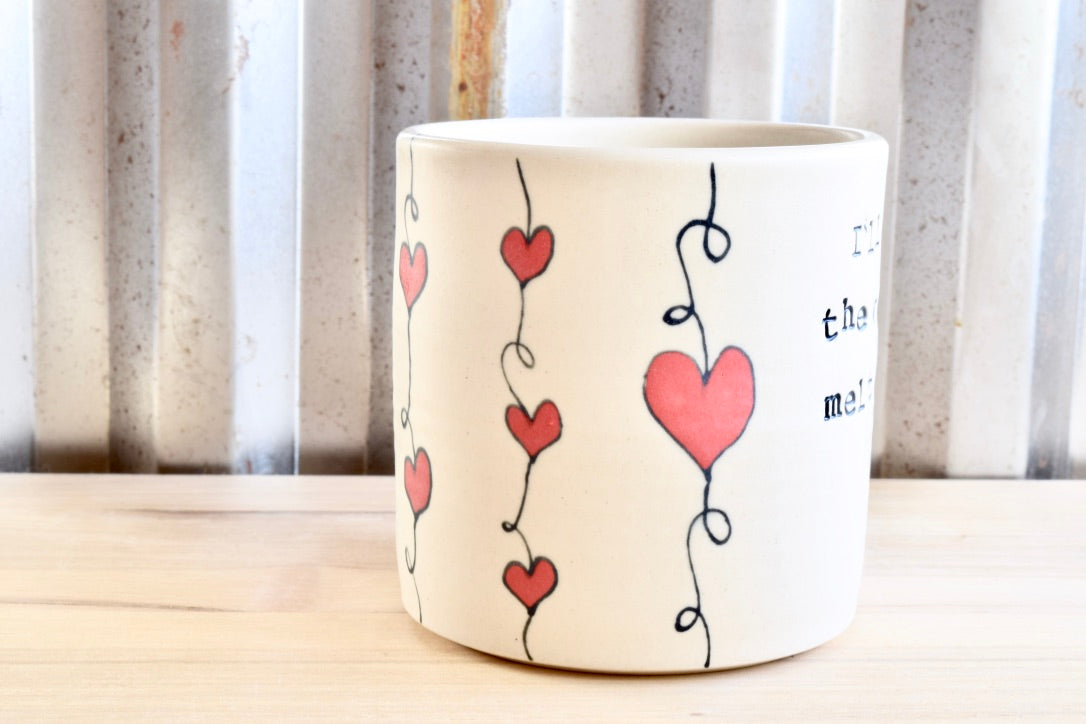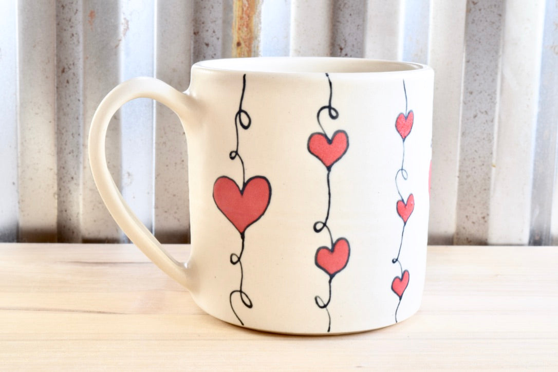 I hand throw this mug on the potter's wheel from a creamy porcelain mix clay. I hand stamp each letter and paint with black underglaze. I hand draw the heart strings with black and red underglaze. The mug is finished with a soft clear satin matte glaze.