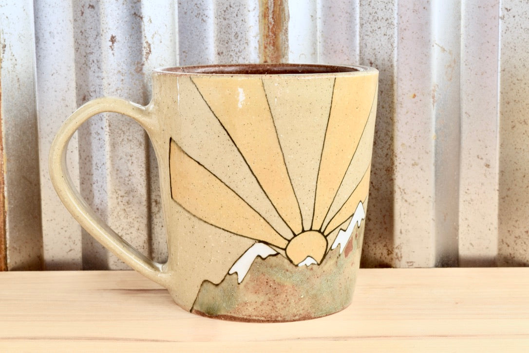 This ochre mug is hand thrown and hand painted and hand stamped. The interior and mountains are glazed with a green shino and the exterior is finished with a clear gloss glaze. The text is glazed with a black underglaze.