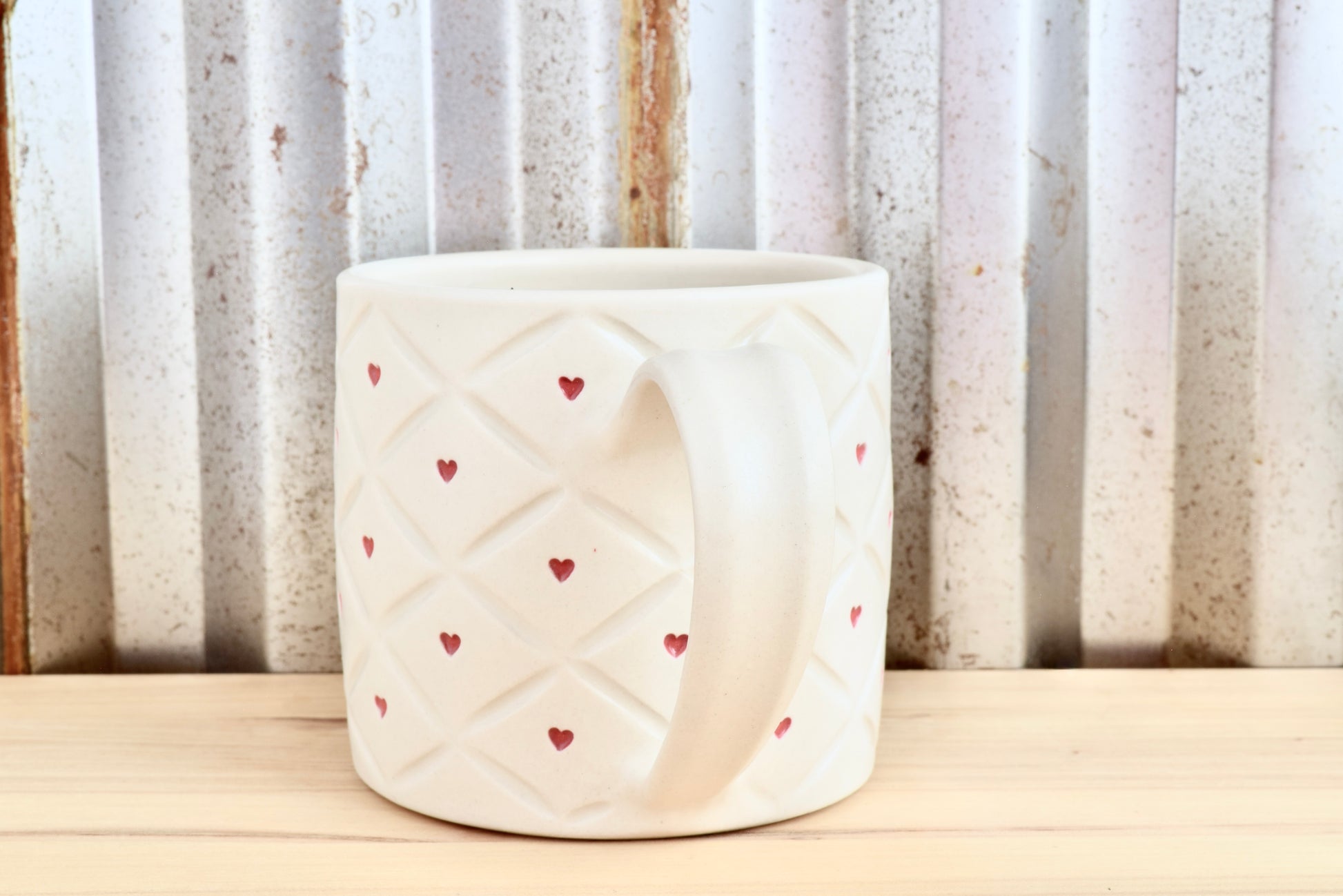 I hand throw this mug on the potter's wheel from a creamy porcelain mix clay. The texture is hand carved and the hearts are stamped one at a time. I paint the stamped hearts and the stencil hearts on the bottoms with red underglaze. The mug is finished with a soft clear satin matte glaze. This mug will hold approximately 14-16 oz.