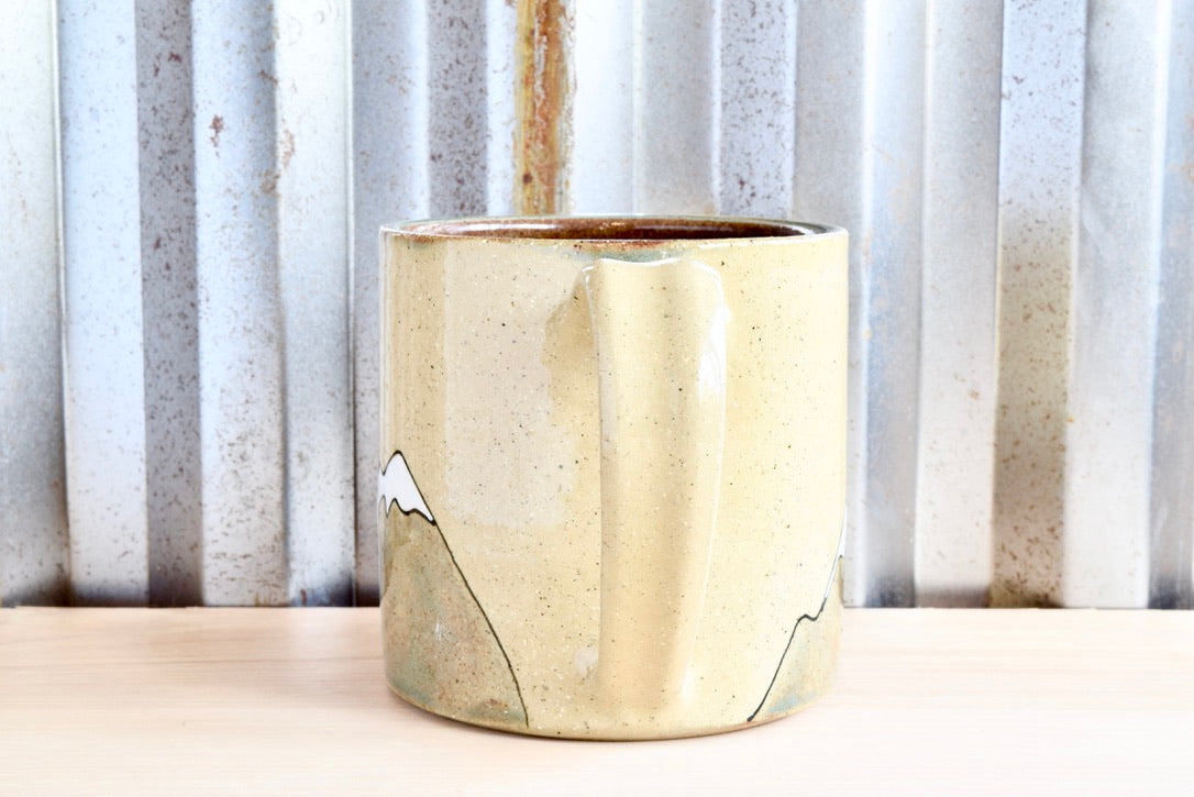 This ochre mug is hand thrown and hand painted and hand stamped. The interior and mountains are glazed with a green shino and the exterior is finished with a clear gloss glaze. The text is glazed with a black underglaze.