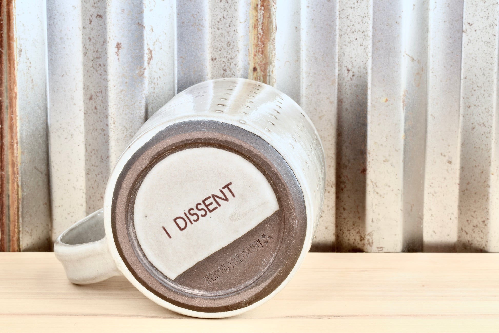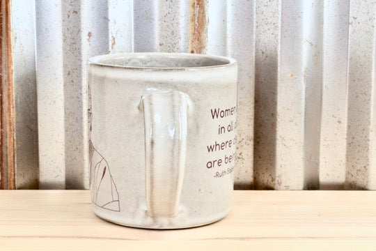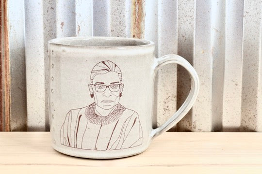 This mug was hand thrown on the potter's wheel from a creamy chocolate clay. It is glazed with a lovely eggshell glaze. The RBG image is my original illustration. The decal RBG and words are applied over the glaze and the cup is fired one last time to permanently affix the decals to the cup. The decals are a dark brown color.