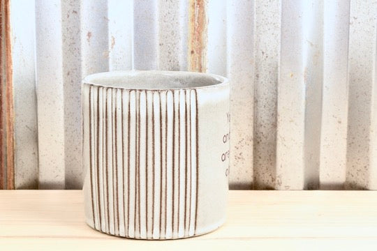 I hand throw this mug with a creamy chocolate clay. It is glazed in an eggshell gloss. The original art illustration and text decals are applied and fired in the kiln for a 3rd time.