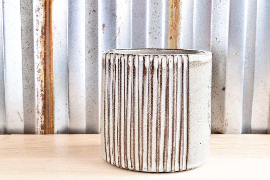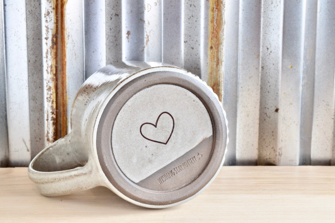 I hand throw this mug with a creamy chocolate clay. I hand carve the texture on outside. It is glazed in an eggshell gloss. The original art illustration and text decals are applied and fired in the kiln for a 3rd time. It has a cute love butt!